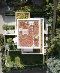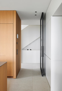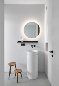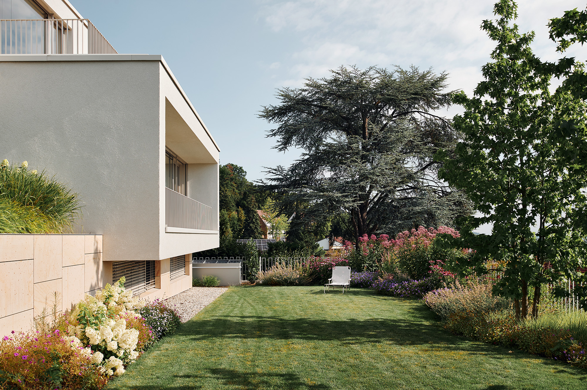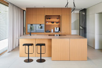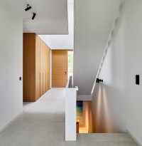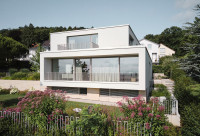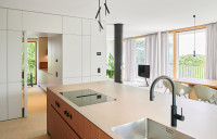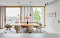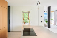 Der Architekt Alexander Bourquin plante und realisierte in Neustadt an der Weinstraße ein Einfamilienhaus für ein privates Bauherrenpaar. Ziel war die Verbindung einer klaren architektonischen Sprache mit hoher Funktionalität und langfristiger Nutzungsqualität. Das Haus O, in einem Wohngebiet der 1970er Jahre gelegen, bietet mit seiner Hanglage am Haardtrand eine atemberaubende Aussicht. Der Neubau besteht aus zwei kubischen, zueinander versetzten Baukörpern. Großzügig verglaste Loggien rahmen die Landschaft nach Süden und Osten zur Rheinebene. Die feinkörnige Putzfassade und der Sockel aus lokalem Natursandstein verbinden örtliche Baumaterialien mit einer zeitgemäßen Architektur. Natürliche Eiche und die Weiterführung der monochromen Farbgestaltung in die lichtdurchfluteten Innenräume unterstreichen Einfachheit und Klarheit und schaffen eine ruhige, wohnliche Atmosphäre.
