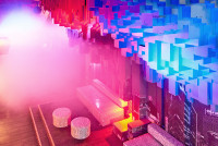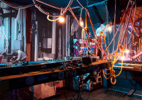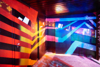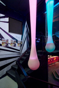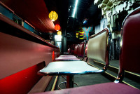 Der Club ist inspiriert von einer Mischung aus asiatischer Popkultur, 70er-Jahre-Futurismus und undergroundigem Industrial-Charme. Die Wände sind mit leuchtenden Neonlichtern, roten Samtvorhängen und Vintage-Elementen verziert, die eine fast filmische Atmosphäre schaffen. Die Kombination aus dunklen Ecken und strahlenden Lichteffekten macht den Club zu einem einzigartigen visuellen Erlebnis. Fotografiert im Auftrag für die Berliner Agentur llot llov.